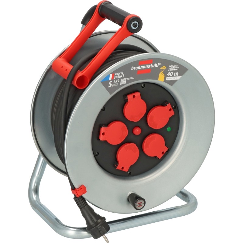 5 prises de courant 2P+T 16A/230V~ avec clapets à fermeture automatique et disjoncteur thermique 1 fiche 2P+T 16A/230V~ Puissance maximale : câble non déroulé 1000W - câble déroulé 3500W Voyant de présence de tension LED intégré au bloc prises de courant indiquant instantanément si l'enrouleur est sous tension et évitant ainsi tout déplacement inutile Poignée de transport "cablepilot" pour un guidage parfait du câble, bascule des 2 côtés permettant ainsi un transport et une accroche faciles, adaptée aux gauchers et aux droitiers Clip de fixation du câble pour assurer son maintien pendant le transport.